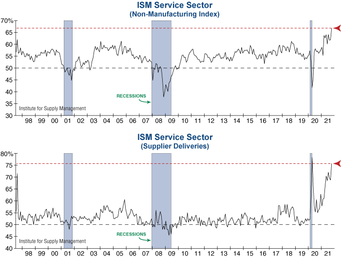The ISM Service Sector surged to the highest level in its 24-year history last month due to the combination of strong consumer demand and supply chain disruptions. Starting with the demand side of the equation, both the New Orders and Business Activity components reached all-time highs in a clear sign of ongoing economic strength. However, anomalies in the global supply chain also skewed this index higher. For example, the bottom chart below shows that the Supplier Deliveries component is at one of its highest-ever readings, meaning that deliveries are taking far longer than usual. Longer delivery times are typically treated as a sign of robust demand, but in this instance supply chain bottlenecks are causing an upward distortion to this measure. In summary, further strength in the leading economic data continues to support a benefit of doubt approach, yet dysfunction across supply chains and the persistence of inflationary pressures must be monitored closely.