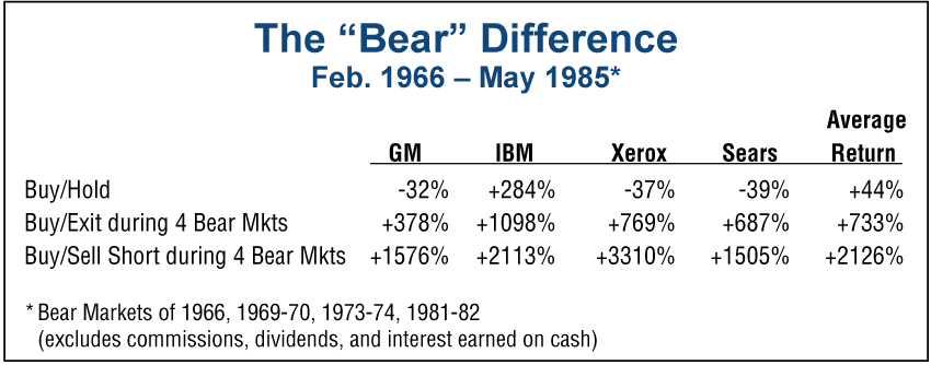 In the first case, each stock was purchased and held for a 20-year period with an average total return of only +44%. However, in the second case, if this hypothetical investor was shrewd enough to exit the stocks during just four bear markets, the return jumped by over 15 times to +700%. The stunning difference becomes even more pronounced in the third case where our hypothetical investor sold short during the bear markets and averaged a whopping +2126% gain! While this 50-fold increase in return isn’t attainable in the real world, it does reveal the critical importance of protecting one’s portfolio.