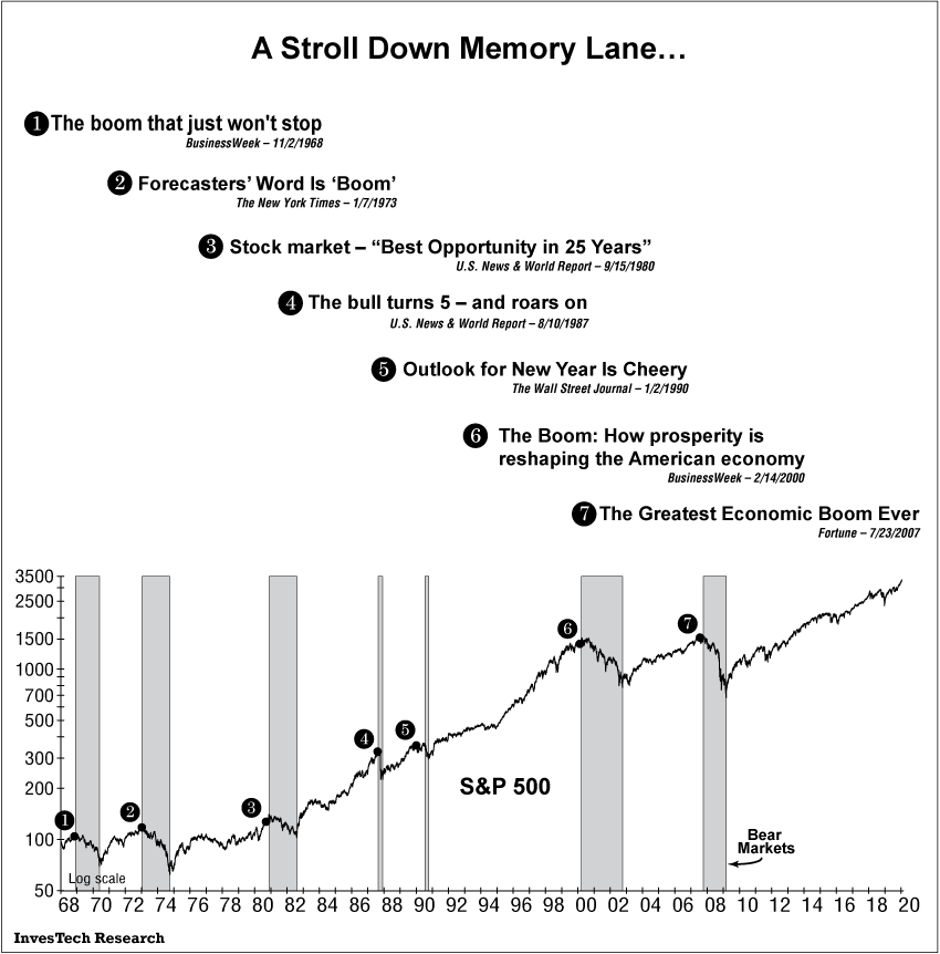 Still, many investors believe that they can stay on top of the stock market just by watching for the inevitable signals of an economic downturn – and that media headlines and news articles will provide ample warning that a bear market lies ahead. History, however, shows otherwise. For those who actually believe they don’t need technical or monetary analysis to see the next bear market in advance, the following graph takes “A Stroll Down Memory Lane” with some of the most respected, reliable, and objective media sources available, including BusinessWeek, The New York Times, U.S. News & World Report, The Wall Street Journal, and Fortune…