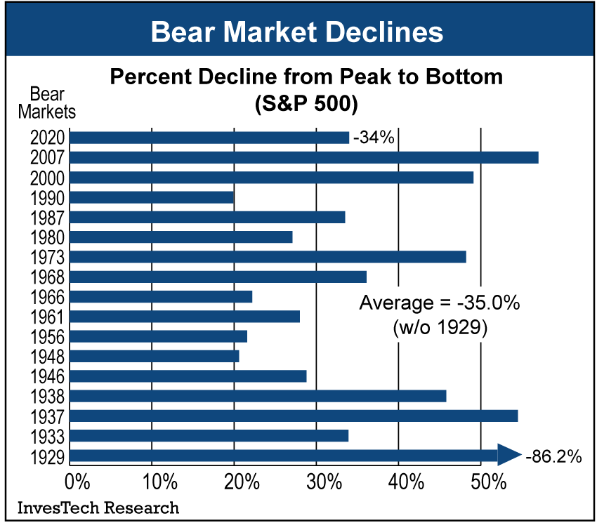Since 1929, we’ve experienced a bear market about every 4-6 years. The average decline of these bear markets, as shown in the following table, has been almost -35% (without 1929).