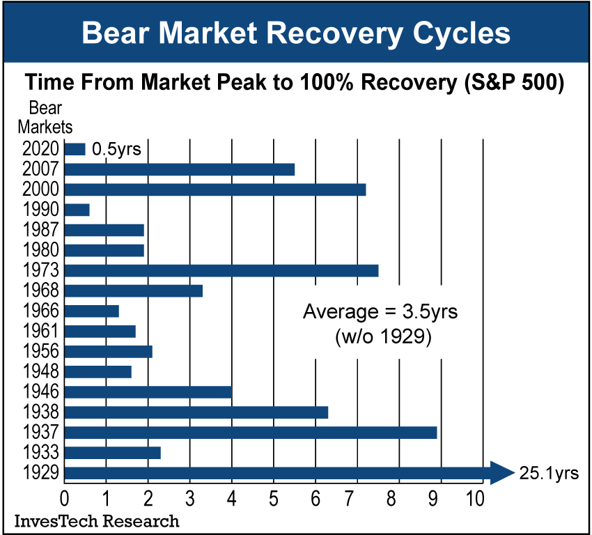 The average length of a bear market for the S&P 500 is 1.4 years. And the average recovery cycle for a bear market is over 3½ years (without 1929)!
