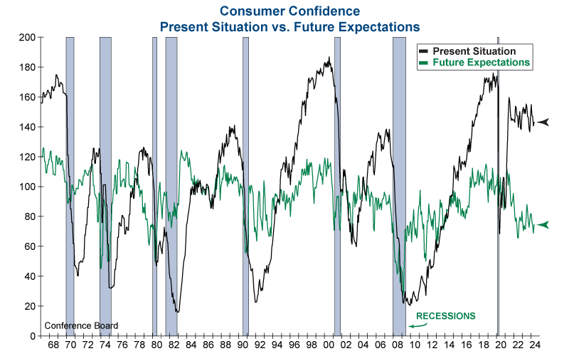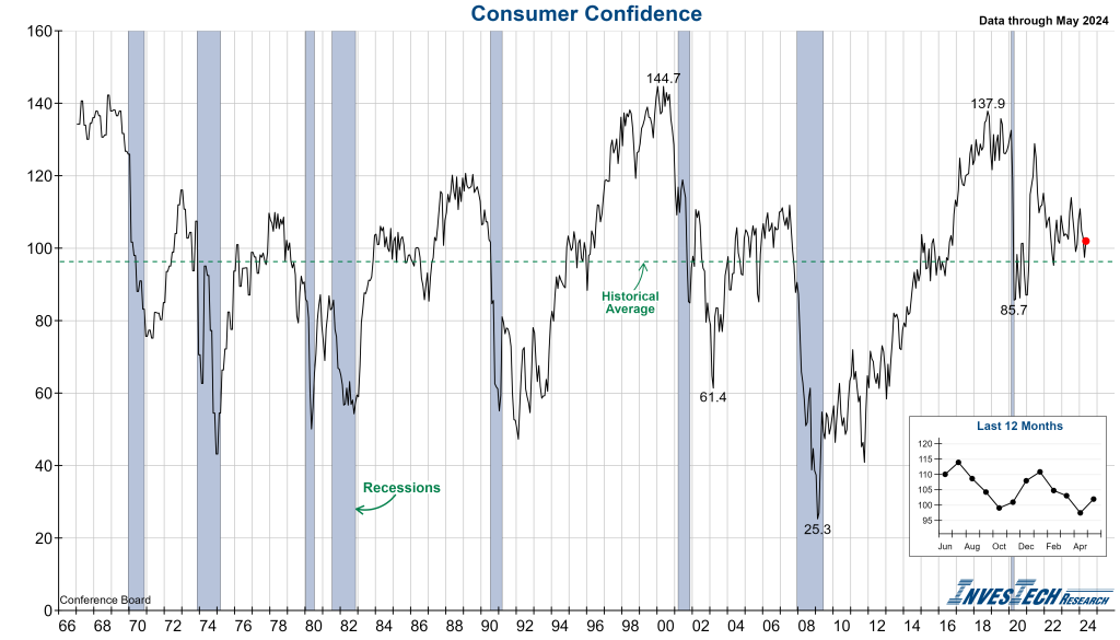 This morning’s Consumer Confidence for May from the Conference Board came in above expectations and was an increase of 4.5 points. The Present Situation Index increased by 3.5 points and the Expectations Index increased by 5.8 points. However, the Expectations Index remains below 80, which the Conference Board considers a recession signal threshold.