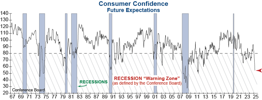 Consumer Confidence from the Conference Board plunged again in April, revealing a nosedive in consumers’ short-term outlook for income, business, and labor market conditions. The drop was consistent across all age groups and political affiliations. This fall was headlined by the Future Expectations component which plunged 12.5 points to 54.4, the lowest level in just over 13 years. This is well below the Conference Board’s “recession warning level” of 80 (graph below).