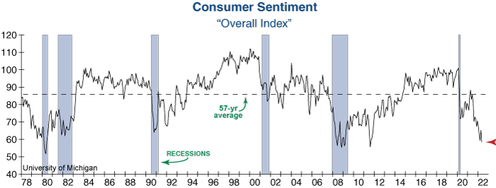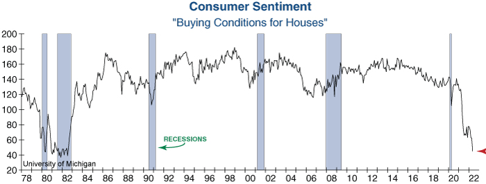 Another concern raised by the dismal Consumer Sentiment report is the fact that consumers view Buying Conditions for Houses as being the worst since 1982. Surging housing prices and mortgage rates have created a double whammy for affordability which has priced many potential buyers out of the market. Thus, if a lack of demand helps spur a downturn in this overextended housing market, the U.S. economy would almost certainly be destined for recession.