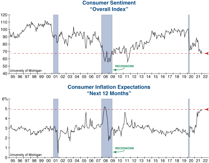 Consumer Sentiment from the University of Michigan fell further below its pandemic lows this month as inflation concerns continue to mount. Inflation expectations for the next 12 months returned to its post-pandemic high of 4.9% to start 2022, and these expectations could remain at an extended level given that the University of Michigan sees the onset of a wage-price spiral: “While supply chains and essential workers have sparked the initial increases in prices and wages, a wage-price spiral that has subsequently developed is no longer tied to those precipitating conditions.” Bottom line, consumer attitudes are at the most depressed level in over 10 years, and the unmistakable reason is inflation.