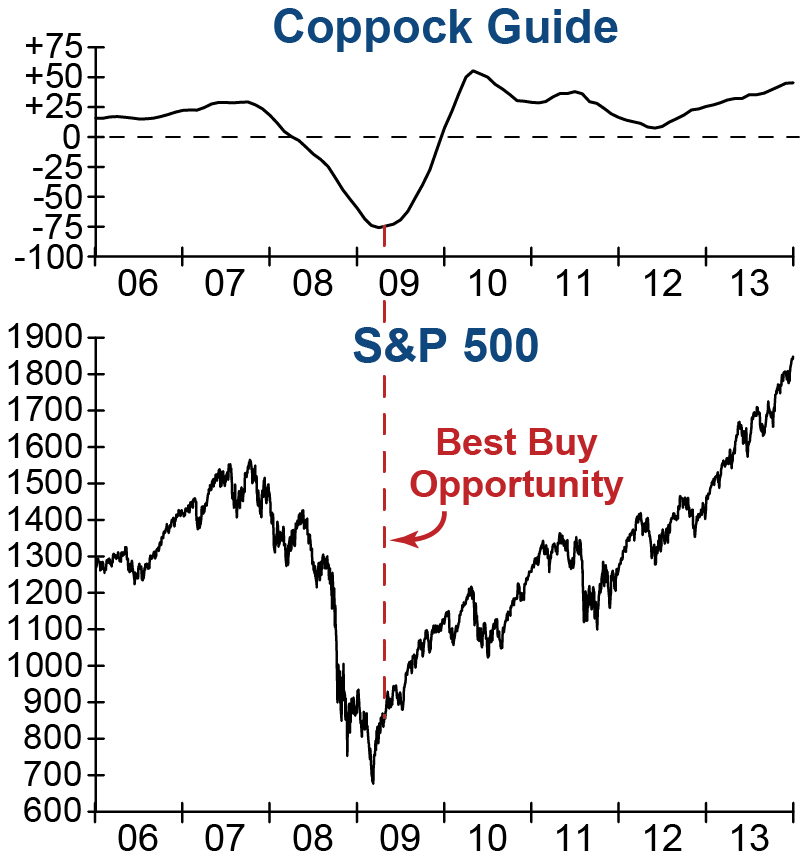 From a technical perspective, the Coppock Guide is known as a momentum oscillator. It is calculated by taking the 10-month weighted moving total of the 14-month rate of change plus the 11-month rate of change of a market index. As a result, it reverses direction when momentum or rate of change in the market peaks. And because market bottoms are usually sudden or “spiked” reversals, this indicator works amazingly well in triggering buy signals.