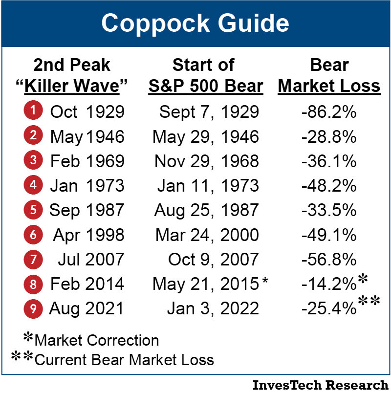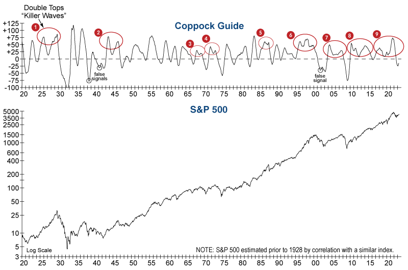 In the late 1960s, a technician named Don Hahn observed another phenomenon about the Coppock Guide. When a double top occurs without the Coppock falling to 0, it signals a bull market that hasn’t undergone any normal, healthy washouts or corrections. That’s a runaway bull market usually headed for disaster. As a result, these dangerous double tops are known as “Killer Waves.” While they have only occurred 9 times in the past 102 years, 5 of them accompanied the beginnings of the most notorious bear markets of the past century: 1929, 1969, 1973, 2000, and 2007.