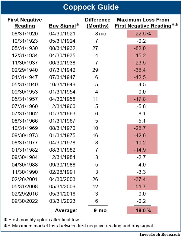 The Coppock Guide clearly has a remarkable track record, yet patience is key to getting the most out of this tool. Some investors may be tempted to start buying before the Coppock’s upturn, however, this can have disastrous consequences as shown in the table at right. On average it takes 9 months for the Coppock Guide to register a buy signal after its first negative reading, and the market suffers an average maximum loss of -18% over this period. This is a serious (and unnecessary) price to pay for those who try to anticipate a market bottom rather than wait for an official Coppock Guide upturn.