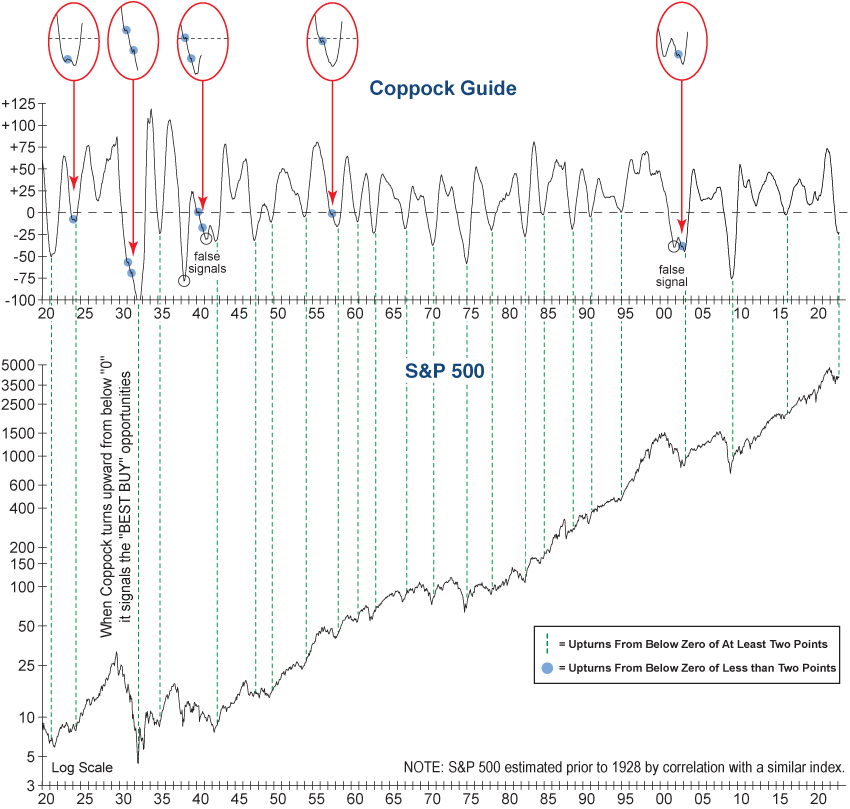 The graph below shows the historical reliability of these buy signals, but also shows why it’s worth waiting for a more defined upturn before making any drastic portfolio changes. Minute upturns can occur during extended bear markets as shown by the blue dots in the graph. Today’s upturn is hardly perceptible at this point, and to have a strong degree of confidence in a potential new bull market, we need the Coppock Guide to continue higher along with confirmation from the rest of the technical evidence.