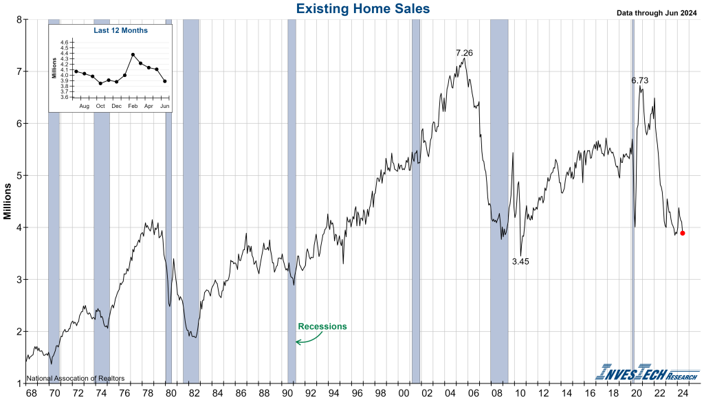 Existing Home Sales fell once again, continuing its downward trend as a result of decades-high mortgage rates and still-limited inventory. Sales activity slipped 5.4% in June and fell by the same on a year-over-year basis.  It is now at its lowest reading this year, which is near its lowest levels since the unwinding of the housing bubble in 2010.