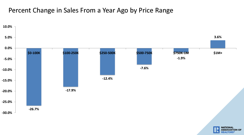 Interestingly, sales of homes priced under $500K have seen the largest declines. This is significant as these lower-priced homes account for approximately 64% of sales, highlighting the broader weakness being masked by higher-end home sales ($1M+).