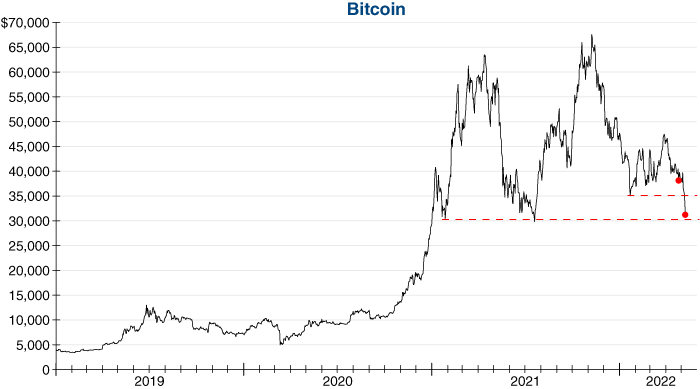 Psychology has rapidly unwound on Wall Street to start 2022, with both the Nasdaq and Russell 2000 Indexes dipping into bear market territory. While our Canary Index, Gorilla Index, and Housing Bellwether Barometer have all broken or are threatening key technical support levels, Bitcoin has remained remarkably resilient following last year’s sell-off (see graph below). For those watching this psychological tug-of-war in the crypto markets, there are two important support levels to watch for Bitcoin… if both are broken, then loss of investor confidence in cryptocurrencies could accelerate.