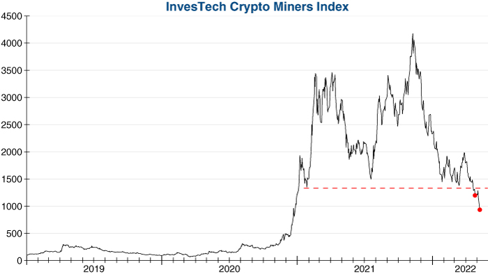 Earlier this year, we began tracking 10 of the leading crypto mining stocks to warn of a potential loss of exuberance surrounding the crypto-mania. As shown by the graph below, our InvesTech Crypto Miners Index has just broken critical support and is trading more than -70% off its high from just five months ago. The carnage in these once-favored crypto stocks is shocking and raises serious questions as to whether this loss of psychology will soon spread to Bitcoin and cryptocurrencies in general.