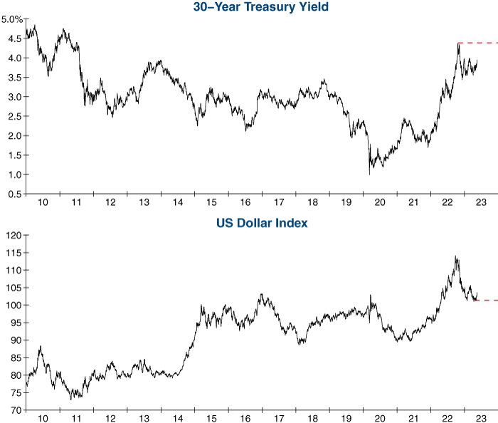 The majority of hoopla surrounding the debt ceiling limit tends to relate to how the market will react. The best bet for positioning your portfolio is to be safe and not sorry…to avoid any volatility or loss in the coming months, it’s best to watch two important warning flags (as we did in 2011): the 30-year Treasury bond yield and the U.S. Dollar Index. Neither are signaling imminent default – the Dollar appears firm and 30-year yields are stable. If a serious default does become imminent, we would expect either the 30-year Treasury Yield to rise sharply or the U.S. Dollar to fall dramatically. If either of these tools start flashing red, we will update subscribers immediately.