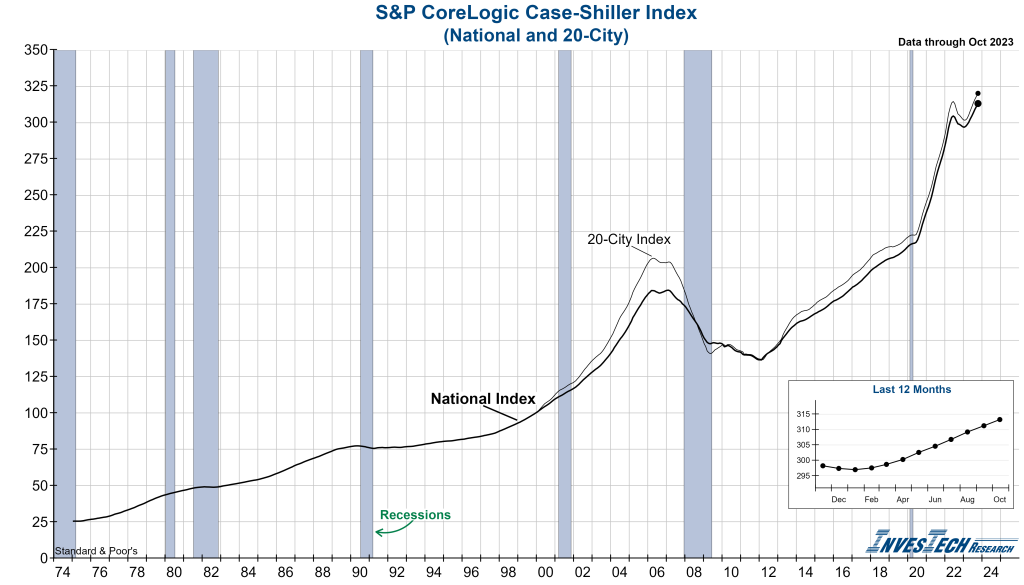 The S&P CoreLogic Case-Shiller US National Home Price Index was released Tuesday morning and increased 0.6% (seasonally adjusted) from September and was up 4.8% year-over-year. The 20-city and 10-city Indexes also saw increases both month-over-month and year-over-year. Of all 20 major metropolitan markets, 11 had month-over-month home price increases in October. The National, 20-city, and 10-city Indexes are at record highs (not adjusted for inflation). Home prices continue to rise, and in fact accelerate, despite high interest rates.