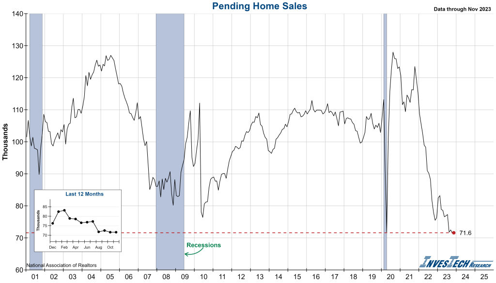 Despite the recent pullback in mortgage rates, prospective buyers who borrow are still struggling with today’s massive unaffordability problem. We will continue to be cautious regarding the housing market as we enter 2024 with record low existing home sales, record high prices, and mortgage rates that remain at multi-decade highs.