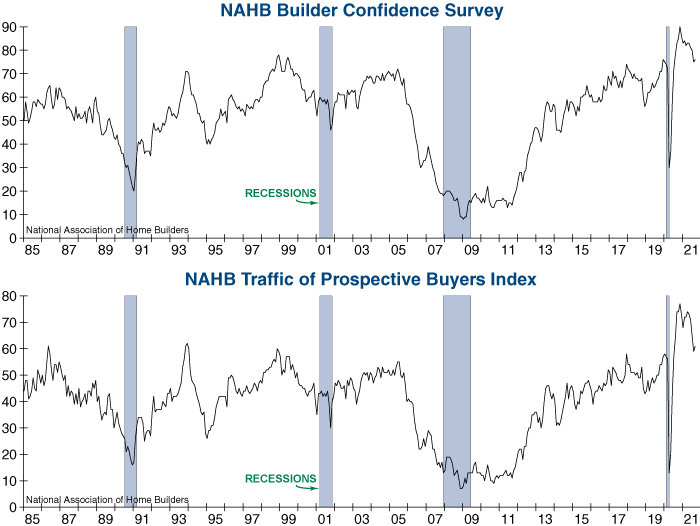 NAHB Builder Confidence registered a warning flag last month after it fell sharply to a 13-month low, yet it managed to rebound by one point in September. Homebuilder’s optimism has waned as they face rising materials costs, labor shortages, and a slowdown in the Traffic of Prospective Buyers (bottom graph). While the slight bounce in this leading housing indicator is a positive, this warning flag will remain in place until it makes a clear break out of its current downtrend.