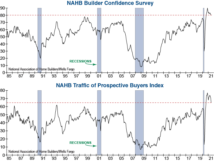 Homebuilders became slightly less optimistic this month according to the National Association of Home Builders (NAHB), yet their confidence remains higher than any point prior to the COVID-19 pandemic (top graph below). Likewise, the Traffic of Prospective Buyers component fell but remains at a historically high level (bottom graph). The NAHB notes that prospective buyers are being increasingly sidelined by high home prices.