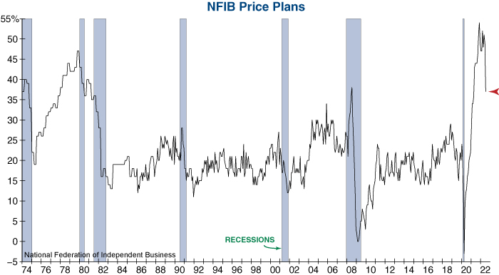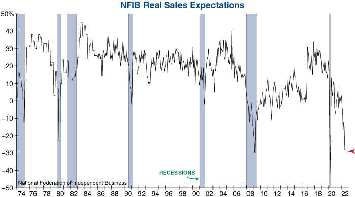 So why did price plans fall so dramatically? As shown in the graph below, it’s primarily because the share of small businesses expecting real sales to grow over the next three months has reached one of the lowest levels on record – indicating that small businesses are seeing a significant slowdown in demand. Furthermore, every other time NFIB Real Sales Expectations has reached this level, it has been during a recession. So, while the evidence shows that inflation has likely peaked, the fact that it is corresponding with a rising risk of recession is not reason for exuberance.