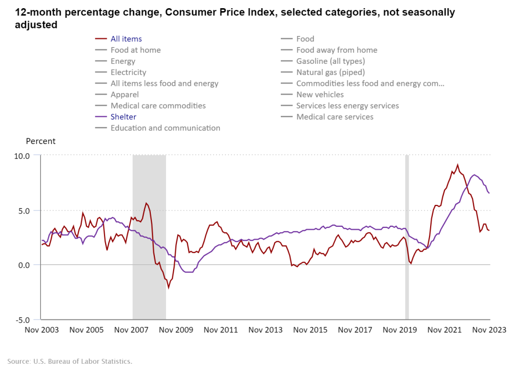 Monthly increases were seen in shelter and food, but a decrease in the energy costs offset these significantly. The increases in Core CPI came from rent, owner’s equivalent of rent, medical care, and motor vehicle insurance. Core CPI has essentially been flat for three months as prices continue to increase, but at a more consistent pace. If inflation does not fall toward the Fed’s 2% target in 2024 as widely anticipated, then rate cuts may fail to appear.*
