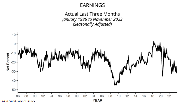 Also released today was the National Federation of Independent Businesses (NFIB) Small Business Optimism Index (SBOI) for November. The NFIB collects small business trend data by surveying their membership base on a monthly basis, and the series goes back to 1973 (quarterly surveys, monthly starting in 1986). This release is an important one to follow each month as small businesses are a large part of the U.S. economy – at least 2 of every 3 new jobs are in small businesses.