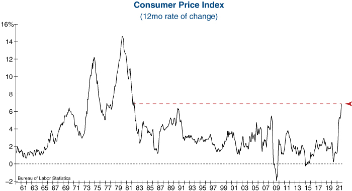 The Consumer Price Index surged to 6.8% in December, the highest level in nearly 40 years. Price increases were broad-based once again, and the CPI’s housing components were major contributing factors as we warned they would be in the latest issue of InvesTech Research. With the FOMC Meeting on deck next week, pressure is mounting on central bank officials to take steps to rein in inflation either by tapering their balance sheet faster and/or hiking interest rates sooner than they have previously communicated. If the Fed does take a more hawkish stance than the market is expecting at their upcoming meeting, then equities will likely face tougher sledding ahead.