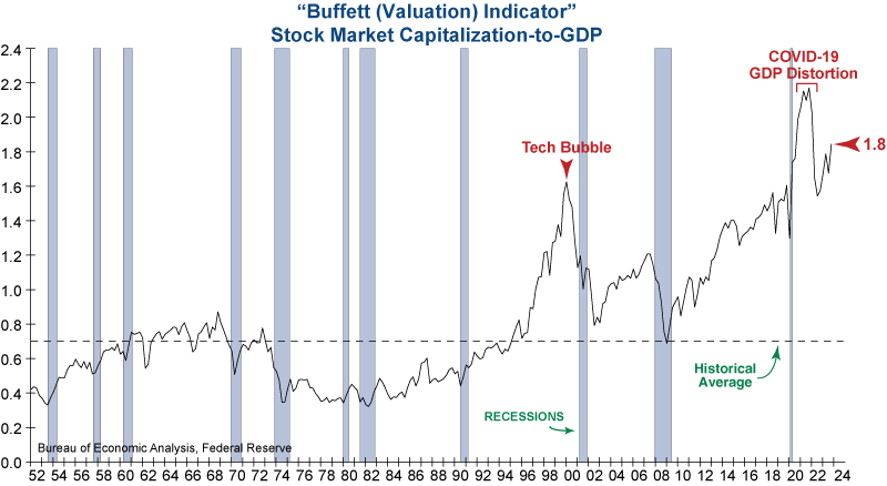 This is problematic for today’s market, as the Buffett Indicator is now at 1.8 and is more than 150% above its long-term average. For perspective, today’s stock market would have to decline more than -50% to get close to its historical average valuation.