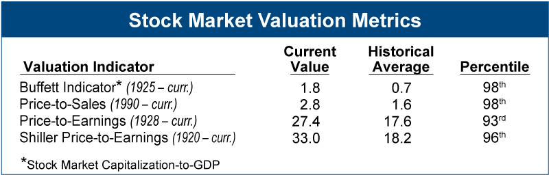 The stock market today trades at one of the most expensive levels in history, which poses a major challenge to investors. Extremely overvalued markets are historically never resolved with fundamentals “catching up” to inflated stock prices. A washout is typically necessary to reverse the excesses. At the end of the storm, however, a generational buying opportunity always emerges for those whose portfolios survive the reset. Below we present a number of valuation metrics that can help gauge overall market risk today.