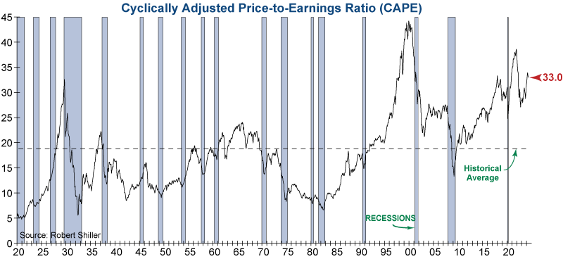 A better way of looking at P/E ratios, popularized by well-known economist Robert Shiller, is the Cyclically Adjusted Price-to-Earnings ratio (CAPE). This uses a 10-year average of real (inflation-adjusted) earnings instead of trailing twelve months or four-quarters, which smooths out many of the major swings in earnings caused by extreme fluctuations in the business cycle. CAPE tends to be a more useful long-term measure of P/E because of this smoothing. The current CAPE ratio is 33.0 (see graph below), which is historically high and demonstrates the extreme priciness of today’s market.