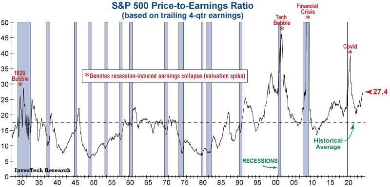 Perhaps the most commonly used –and at times most distorted– valuation metric for the stock market is the S&P 500 Price-to-Earnings (P/E) ratio. One of the more popular calculations for P/E relies on “forward-looking” earnings, which make stock prices appear reasonable near market peaks. That inherently gives a false sense of security to unsuspecting investors at some of the most dangerous times. Of course, when a recession hits, those forward-looking earnings disappear as companies struggle to maintain sales.