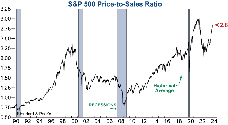The P/S ratio is effective as a valuation indicator because, unlike earnings, sales are less subject to accounting adjustments or manipulations, making it particularly reliable. The current P/S ratio for the S&P 500 Index is 2.8, which is one of its highest readings since 1990 and is almost 80% above its long-term average.