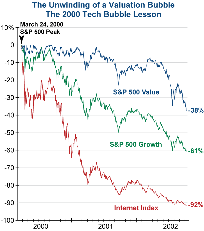Not all sectors, industries, and stocks carry the same level of risk. To illustrate, let’s step back to the late 1990s, which was also a period of excessive speculation and high valuation. The graph below shows how different areas of the market performed in the years after the bursting of the Tech Bubble in 2000.