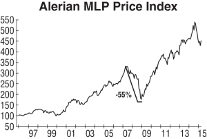 Most MLPs manage to maintain distributions even in a weak economy. However, they need to have profits to make payouts. In recent downturns, it’s become apparent that distributions can decline or even disappear altogether. Several 2007 members of the Alerian MLP Index were forced to cut distributions significantly in the last recession (and it’s interesting to note that they have since been dropped from the Index).