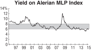 Due to this favorable tax treatment, the level of distribution or yield for MLPs is generally high and can be very attractive to potential investors. One of the primary benchmarks used to track these publicly traded partnerships is the Alerian MLP Index, which includes 50 of the most prominent MLPs. The yield for this Index over the past 20 years is shown in the graph at right. Note that the yield has generally been in the 6-8% range, and has occasionally jumped to over 10%.