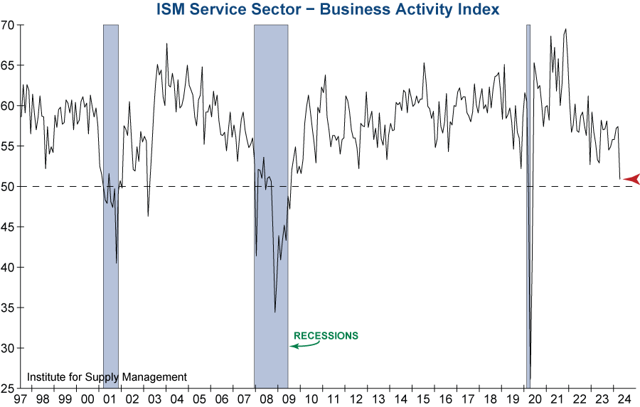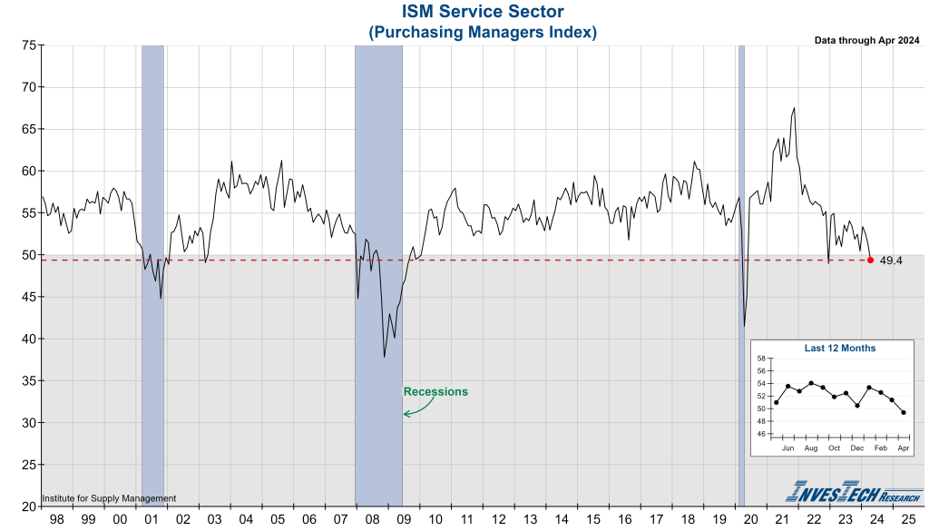 This morning, the Institute for Supply Management (ISM) released their Services Purchasing Managers Index (PMI) for the month of April. For the first time in 17 months, the Services PMI has fallen into contraction territory (<50.0), coming in at 49.4. Contraction in services is rare – aside from the brief contractionary reading in December 2022, the only other instances in the past two decades are the pandemic shutdown (2022) and the Great Financial Crisis (2007-2009).