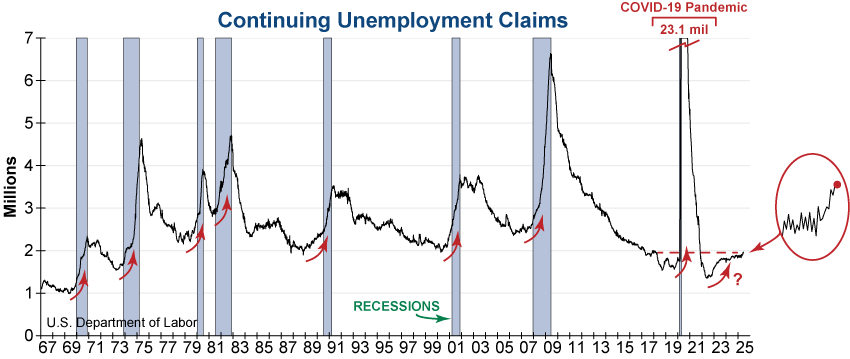 While the report was seemingly good news, it represents a conundrum with other employment data as shown in the June issue of InvesTech Research. An especially concerning labor market indicator is Continuing Unemployment Claims, which has continued its upward trend. This indicator usually rises going into recessions and should not be ignored.