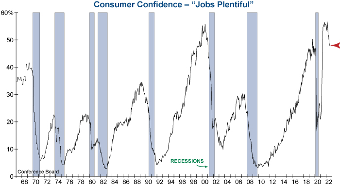 While the data above provides important context, these are still lagging indicators and don’t tend to predict where the labor market is headed. When we turn to a reliable leading employment indicator –the share of consumers that see jobs as being “plentiful”– the situation looks even worse. As shown below, this measure continued to decline in Tuesday’s release and is now down by over -8 points from its March peak. Every other time this indicator has fallen by a similar amount in the past, the economy was destined for recession.