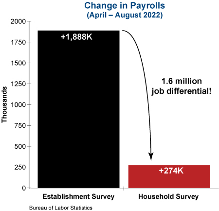 The figures above come from the Bureau of Labor Statistics’ (BLS) “Establishment Survey”, which surveys businesses and government agencies about their employment actions. The BLS also conducts a “Household Survey”, which surveys individual households about their employment situation. As shown in the graph below, there has been a difference of more than 1.6 million jobs between the Establishment Survey and the Household Survey in recent months! The difference becomes even more stark when it’s revealed that the entire gain in the Household Survey has been due to part-time employment, as full-time jobs have actually decreased over the past five months.