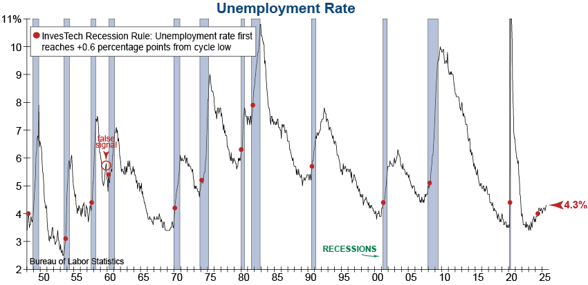 This breakout to new highs in the unemployment rate is an extremely concerning sign for the U.S. economy. It is especially problematic following the triggering of the InvesTech Recession Rule in May of last year. This signal triggers when the unemployment rate reaches +0.6 percentage points from its cycle low and has preceded every recession over the last 77 years with only one false signal in 1959.