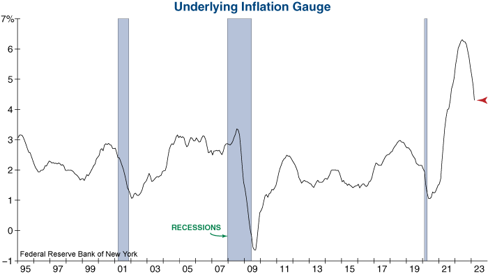 The UIG is a useful inflation forecasting tool that derives trend inflation from a wide range of nominal, real, and financial variables in addition to prices.  The recent UIG release also showed a significant decrease last month. Looking at the graph below, this precipitous drop is telling as these tend to occur when economic conditions are deteriorating at a rapid pace.