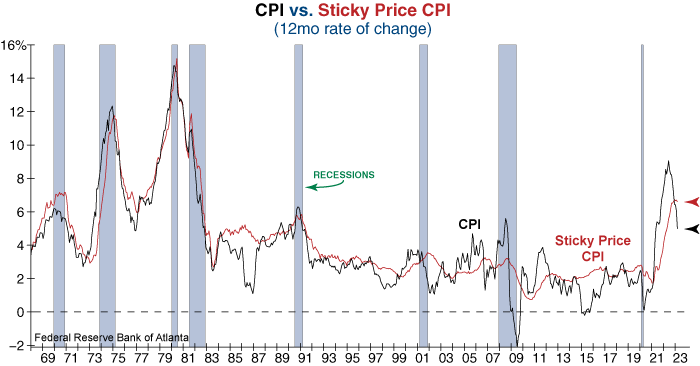 Headline CPI fell to 5% in March from 6% in February– a significant decrease. However, Sticky Price CPI – a weighted basket of items that change price relatively slowly – is at 6.5% YoY, down slightly from the previous month but falling much more slowly than Headline CPI. This tells us that today’s price pressures remain sticky in nature, significantly reducing the Fed’s ability to quickly shift policy should economic conditions continue to deteriorate.
