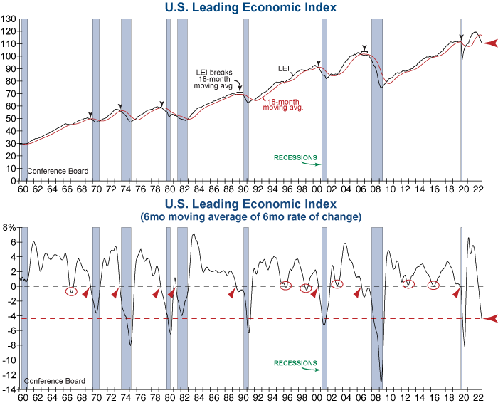 The Conference Board’s Leading Economic Index (LEI) fell for the 10th consecutive month in December, as negative contributions from eight of its ten components shows broad-based weakness. With the LEI now far below its 18-month moving average (top graph) and its six-month moving average of the six-month rate of change deeply negative (bottom graph), history indicates that recession is most likely already underway. The Conference Board concurs, stating that the LEI is “continuing to signal recession for the US economy in the near term.” In spite of another negative LEI data point, the market continues to remain stable – confirming the current tug of war between macroeconomic weakness and technical strength in breadth and leadership.