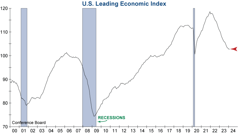 The Conference Board’s (CB) Leading Economic Index (LEI) increased 0.1% in February – its first monthly increase since February 2022. Major contributors to the increase include strength in stock prices, the CB’s Leading Credit Index, weekly hours worked in manufacturing, and residential construction. Still weighing on the Index are consumers’ expectations for business conditions, new orders, as well as the inverted yield curve.