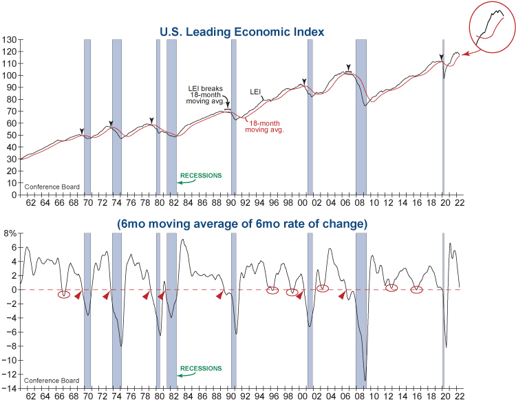 After this decline, the LEI is now on the verge of giving two different recessionary signals. First, the LEI has come dangerously close to crossing below its 18-month moving average (top graph below), which has a reliable historical track record as a warning flag for recession. Likewise, the LEI’s rate-of-change is now very close to falling into negative territory (bottom graph), which would be another indication of a potential downturn in the U.S. economy. Both signals are so close to being reached, in fact, that another decline of this magnitude in the next report would trigger both LEI warning flags. Finally, with today’s concerning message from the LEI, the Conference Board is now unequivocally warning of an upcoming recession: “The forward-looking LEI points to a US economic downturn ahead… A US recession around the end of this year and early next is now likely.”