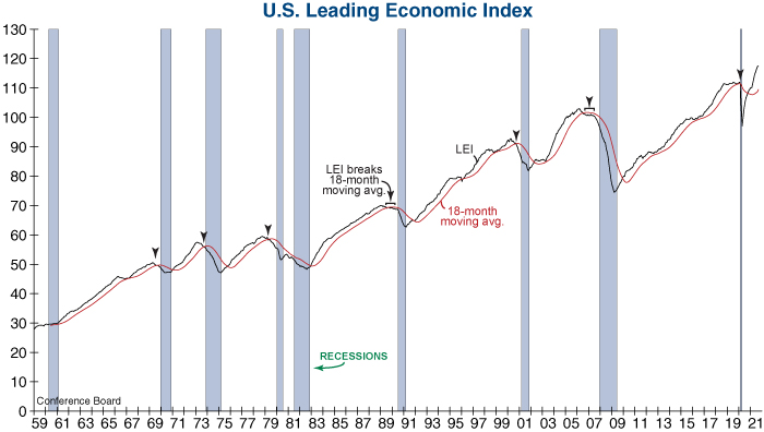 The Conference Board’s Leading Economic Index (LEI) increased to another record high in September, yet last month’s growth of 0.2% missed economists’ expectations and was the second slowest reading since last year’s COVID-induced recession. While positive LEI readings point to further economic growth, the slowdown in the most recent reading could be an indication that growth will be cooler than expected in the months ahead. Even so, the LEI would need to begin declining and cross under its 18-month moving average before a recessionary warning flag is raised by this indicator.