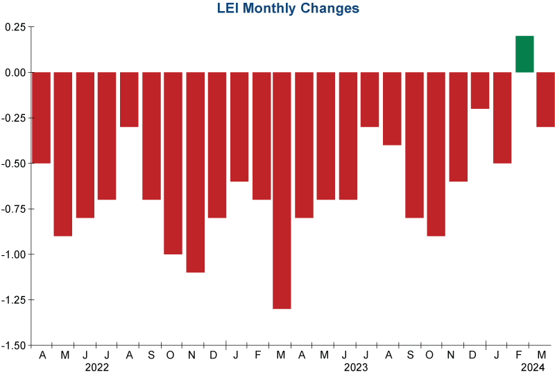 The Leading Economic Indicator (LEI) from the Conference Board has fallen 0.3% in March after a brief, one-month improvement in February. It has declined 24 out of the last 25 months and continues to provide a recessionary outlook. Half of the ten components that make up the LEI were negative. The majority of the decline was driven by adverse monetary conditions (negative yield spread) along with weakness in building permits, consumer sentiment, and new orders.