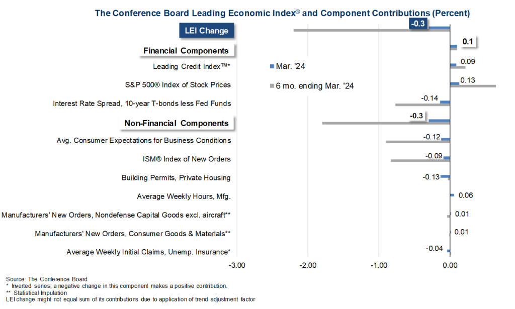 “February’s uptick in the U.S. LEI proved to be ephemeral as the Index posted a decline in March,” said Justyna Zabinska-La Monica, Senior Manager, Business Cycle Indicators, at The Conference Board. “Negative contributions from the yield spread, new building permits, consumers’ outlook on business conditions, new orders, and initial unemployment insurance claims drove March’s decline. The LEI’s six-month and annual growth rates remain negative, but the pace of contraction has slowed. Overall, the Index points to a fragile—even if not recessionary—outlook for the U.S. economy…”