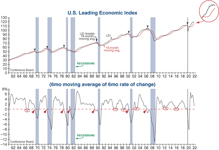 Recession fears have emerged in recent weeks, and the latest release of the Conference Board’s Leading Economic Index (LEI) shows that these fears are not unfounded.  The LEI has declined for the third straight month and is starting to look concerningly “toppy” (see top graph below). Furthermore, the LEI’s rate of change is falling very quickly and may soon cross into negative territory which historically has often been indicative of a potential recession. While the LEI hasn’t yet crossed under its 18-month average or turned negative on its rate of change, both signals will confirm recession in short order if the current trend continues.