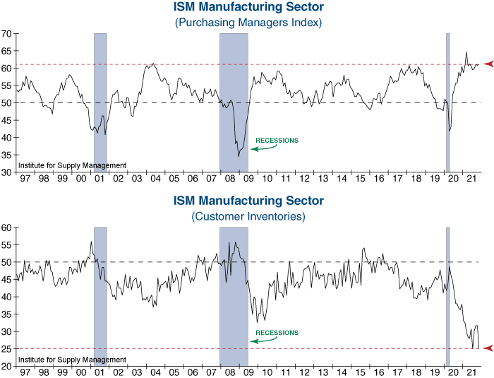 The ISM Manufacturing Index ticked higher to a reading of 61.1 in November, keeping it at a historically strong reading. Manufacturers continue to see robust demand with new orders continuing to grow, which is helping to offset challenges presented by inflation, a shortage of qualified labor, and supply-chain issues for the time being. As stated by the Institute for Supply Management, “Coronavirus pandemic-related global issues — worker absenteeism, short-term shutdowns due to parts shortages, difficulties in filling open positions and overseas supply chain problems — continue to limit manufacturing growth potential.” As a result, the Customer Inventories component sunk back to its lowest level on record last month in a clear sign that supply-demand imbalances are persisting.