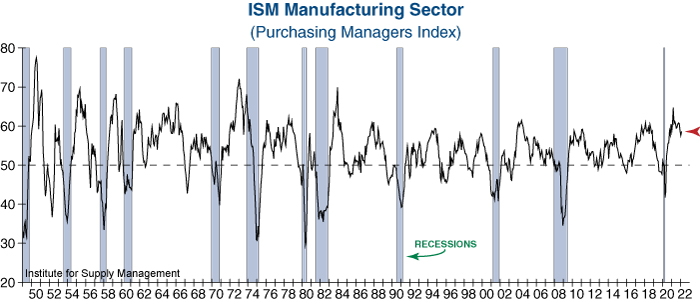The ISM Manufacturing Index jumped by one point and remains at an historically strong reading of 58.6 after having contracted for the previous three months. Robust demand drove last month’s increase as the New Orders Index grew by +3.8 points and the Backlog of Orders surged by +8.6 points. However, wage inflation and labor shortages remain a concern as the Institute for Supply Management states that: “A higher-than-normal quits rate and early retirements continued.